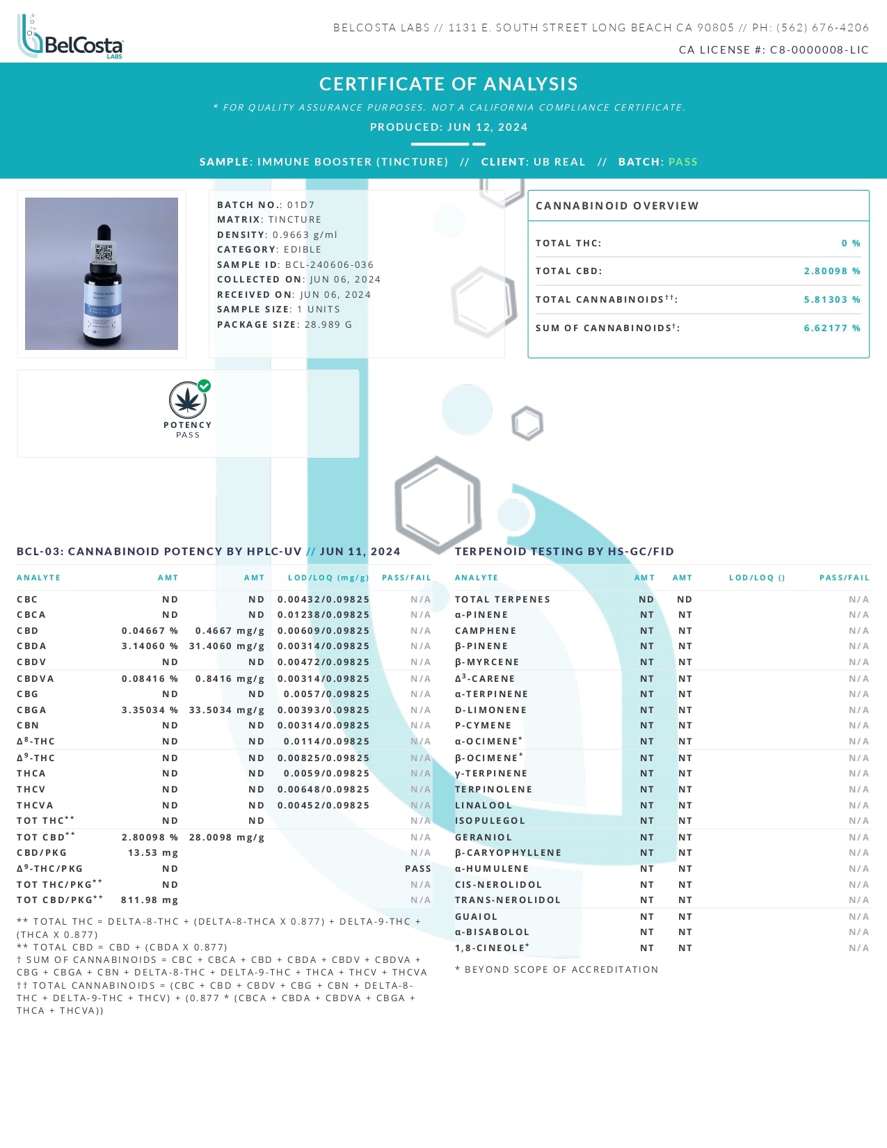 Immune Booster Tincture Plus combines two very important Cannabinoid acids from hemp (Cannabis sativa) being Cannabigerolic acid and Cannabidiolic acid. In a recent clinical study conducted by Oregon State University, both of these Cannabinoid acids in complement to vaccines, prevented infection of human epithelial cells by a pseudovirus expressing the SARS-CoV-2 spike protein and prevented entry of live SARS-CoV-2 into cells. This formula can be used as a booster in tandem to complement any of our UB Super formulas for added immunity.
