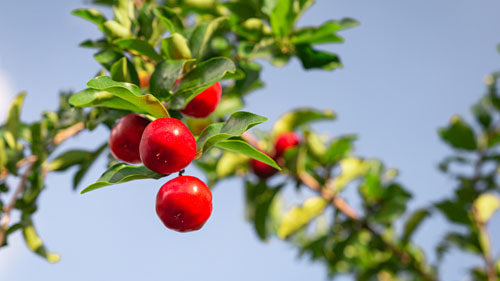 Acerola (Malpighia emarginata) is a shrub or small tree. Its fruit is similar to a cherry and is a red color when ripe. It is a rich source of Vitamin C. Acerola also contains many minerals and other vitamins, including beta-carotene, luein, thiamine, riboflavin, niacin, pyridoxine, folic acid, and pantothenic acid.