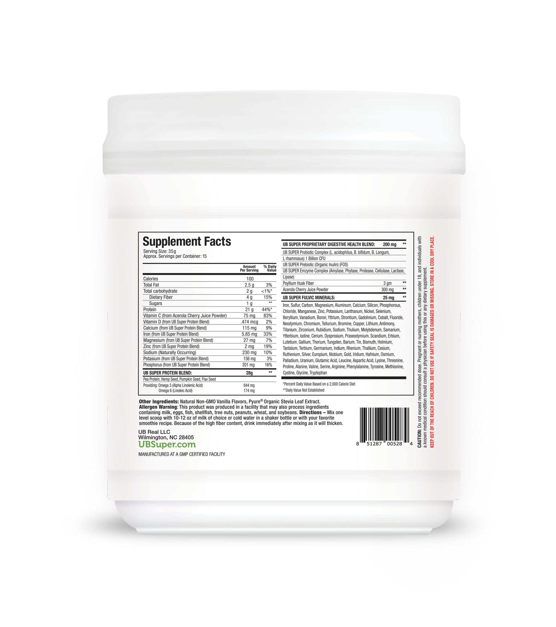 Vitamin C (From Acerola Cherry Juice Powder), Vitamin D (From UB Super Protein Blend), Calcium (From UB Super Protein Blend), Iron (From UB Super Protein Blend), Magnesium (From UB Super Protein Blend), Zinc (From UB Super Protein Blend), Sodium (Naturally Occurring), Potassium (From UB Super Protein Blend), Phosphorus (From UB Super Protein Blend)